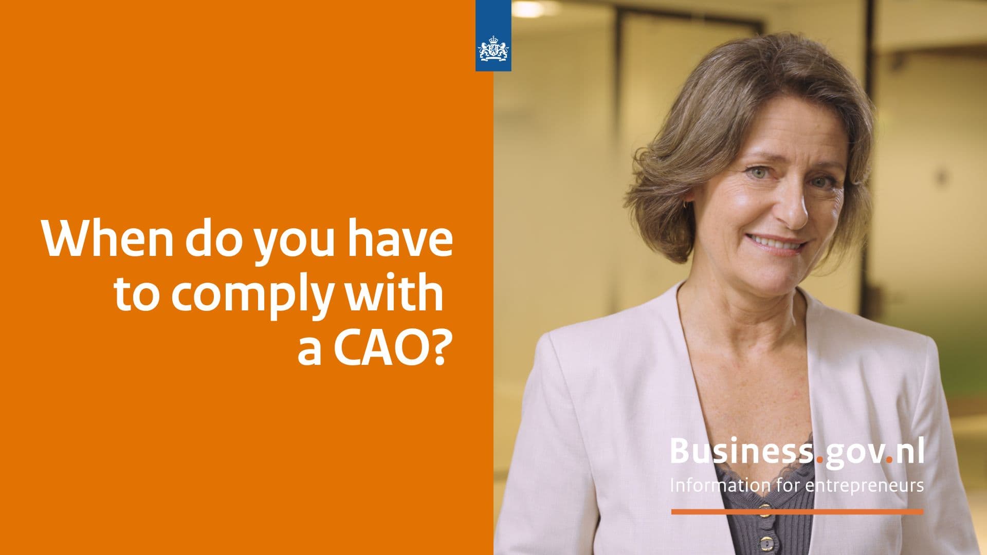 FAQ FAQ- FAQ: When do you have to comply with a CAO?- Are you hiring staff? Often, you must adhere to a collective labour agreement (Collectieve Arbeidsovereenkomst, CAO). Watch this video to find out more. Watch now01:10